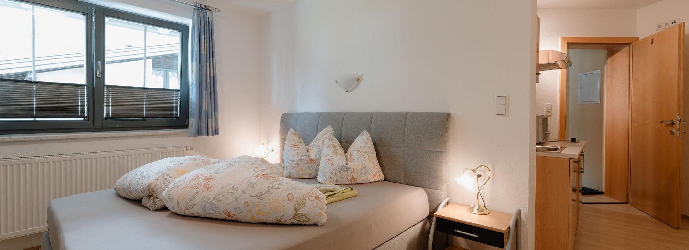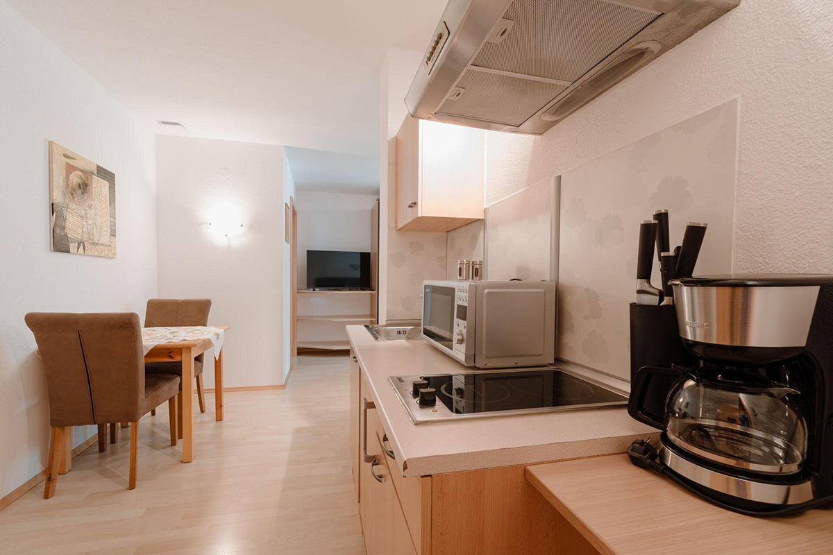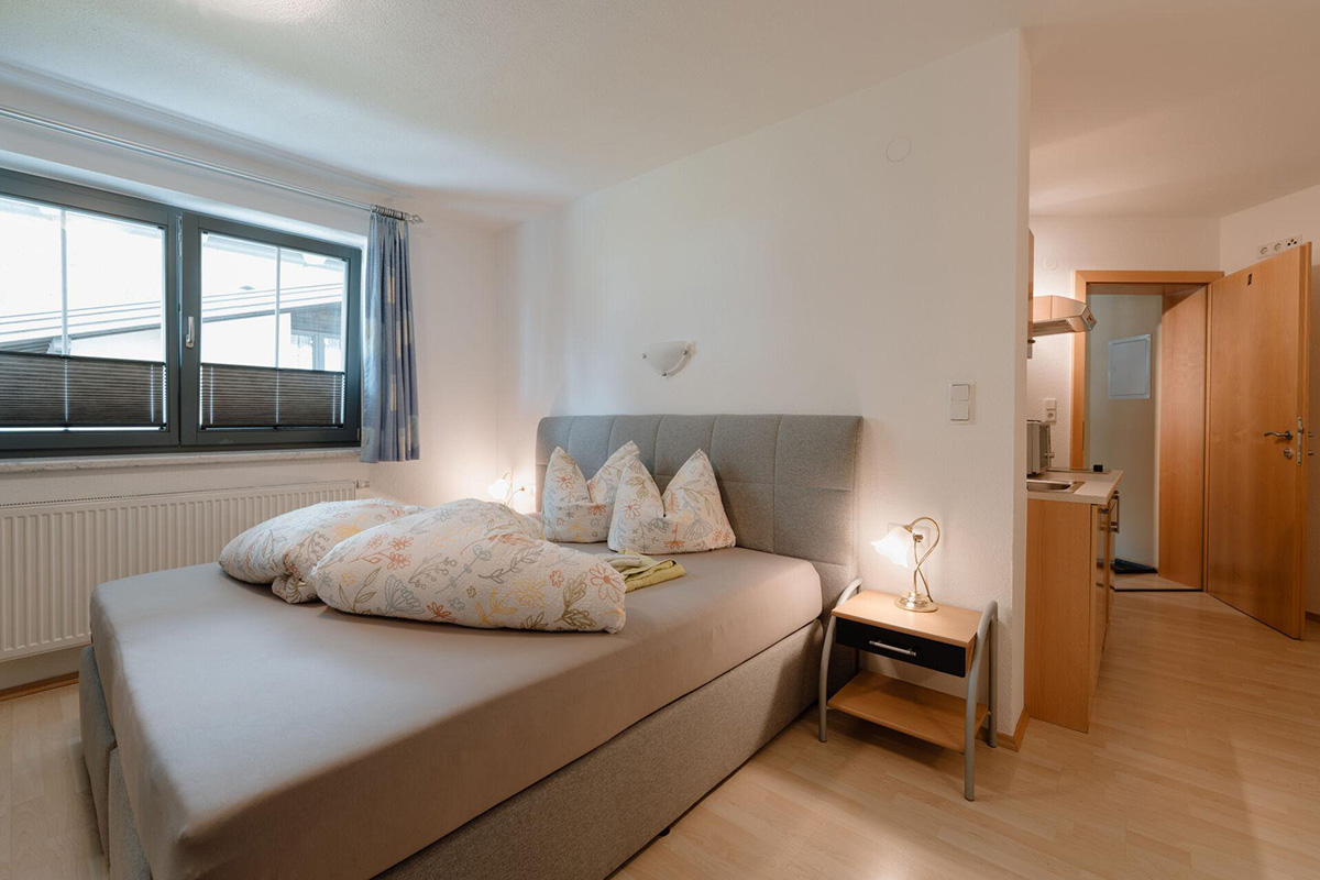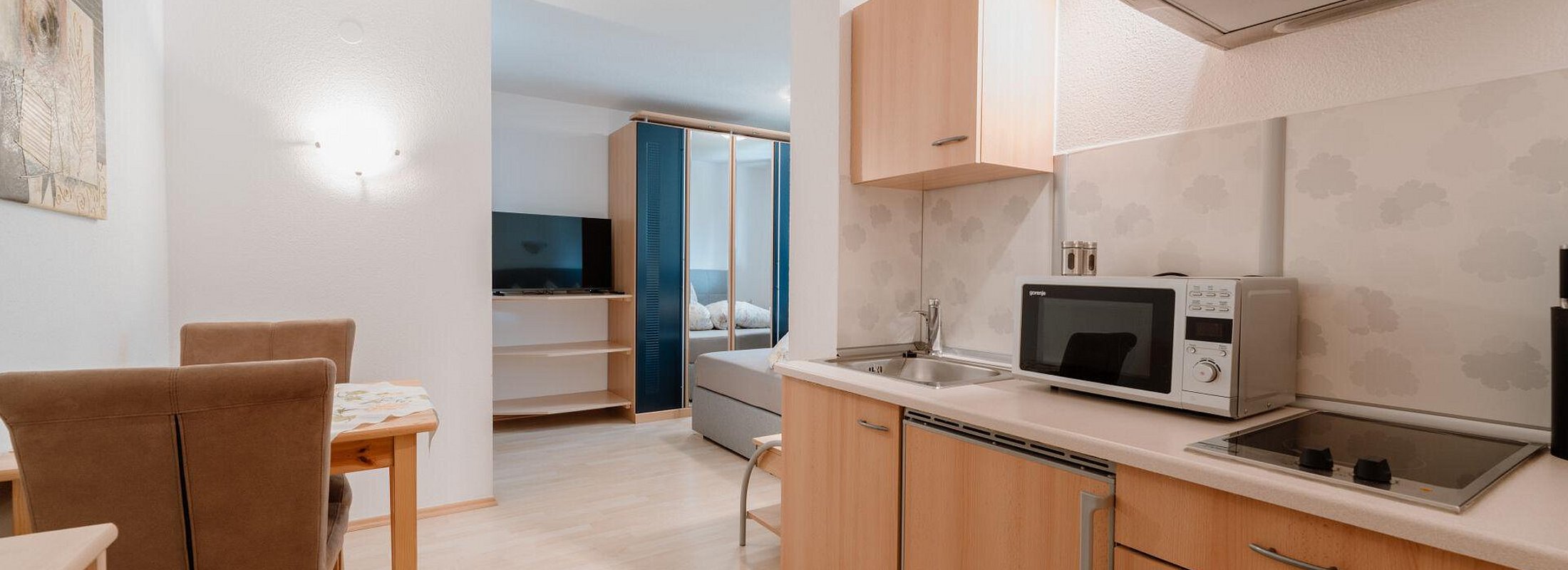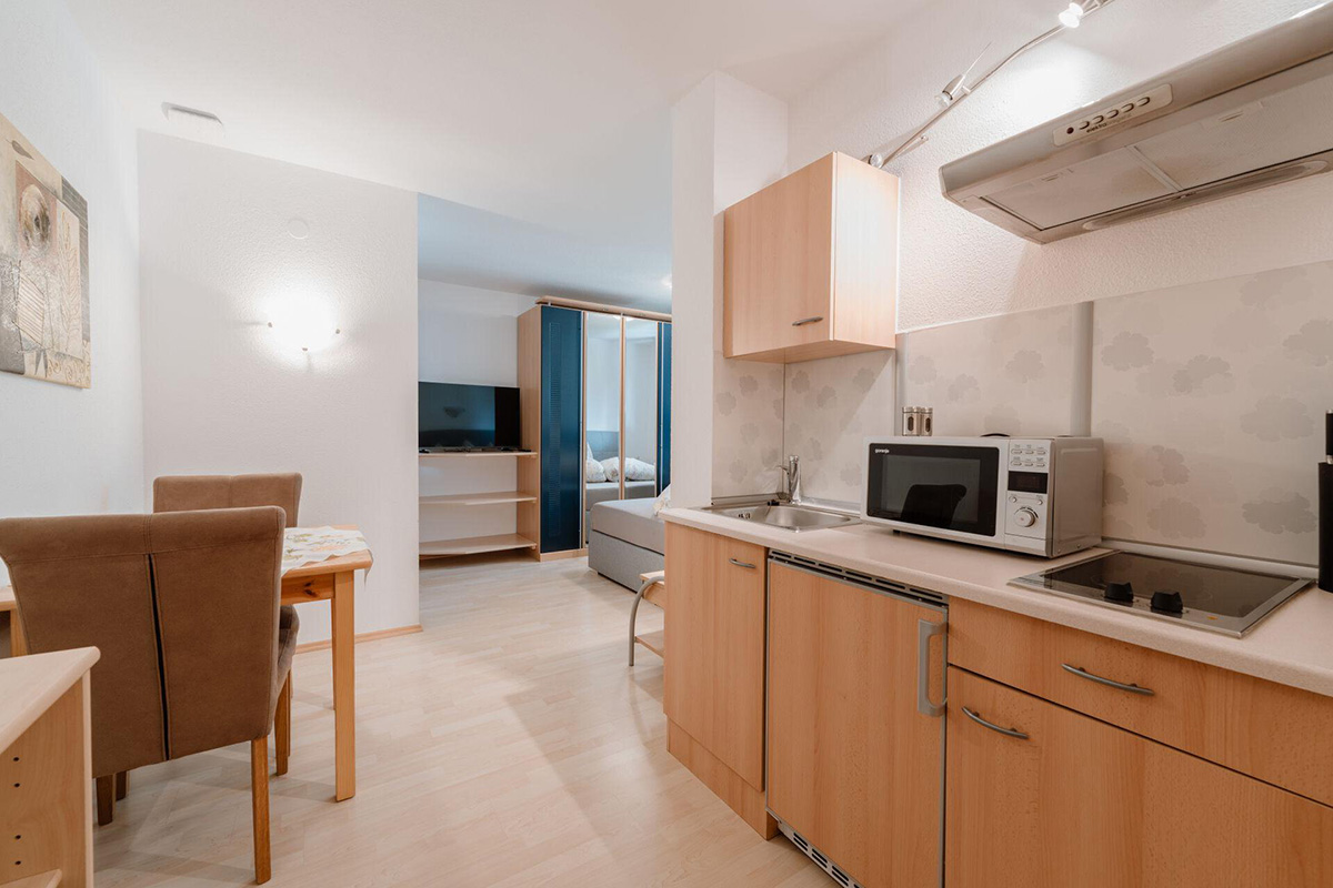 Unser gemütliches Studio verfügt über folgende Ausstattung: ein Doppelbett (Boxspringbett), eine kleine Küchenzeile (Kühl-/Gefrierschrank, Kaffeemaschine, Mikrowelle, Wasserkocher, Cerankochfeld mit 2 Kochplatten u.v.m.) mit Sitzgelegenheit und Flat-TV sowie ein Badezimmer mit Dusche/WC.
